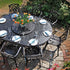 The Gloria 8-seater garden furniture set in antique bronze is a spacious and convivial option for outdoor dining. Featuring an interwoven lattice design within a braided border the Gloria is a stylish oval table set for a larger group. Having responded to customer feedback, this table has a fully-rounded edge as it did in previous models. Achieving this elliptical shape on such a large size speaks for the skill and care in its crafting. The antique bronze is classic and works well in most settings.
