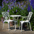 The 2-seater Eve bistro table in white is a charming option for a small balcony or sunny corner. Featuring a detailed metalwork design within a braided border, this is the ideal table when space is at a premium. Eve is perfect for a morning expresso or supper with a friend. This 2-seater garden table set comes with 2 comfortable April chairs as standard, but you can also customize it with your choice of seating. The white finish is cool and fresh and works well in a variety of settings.
