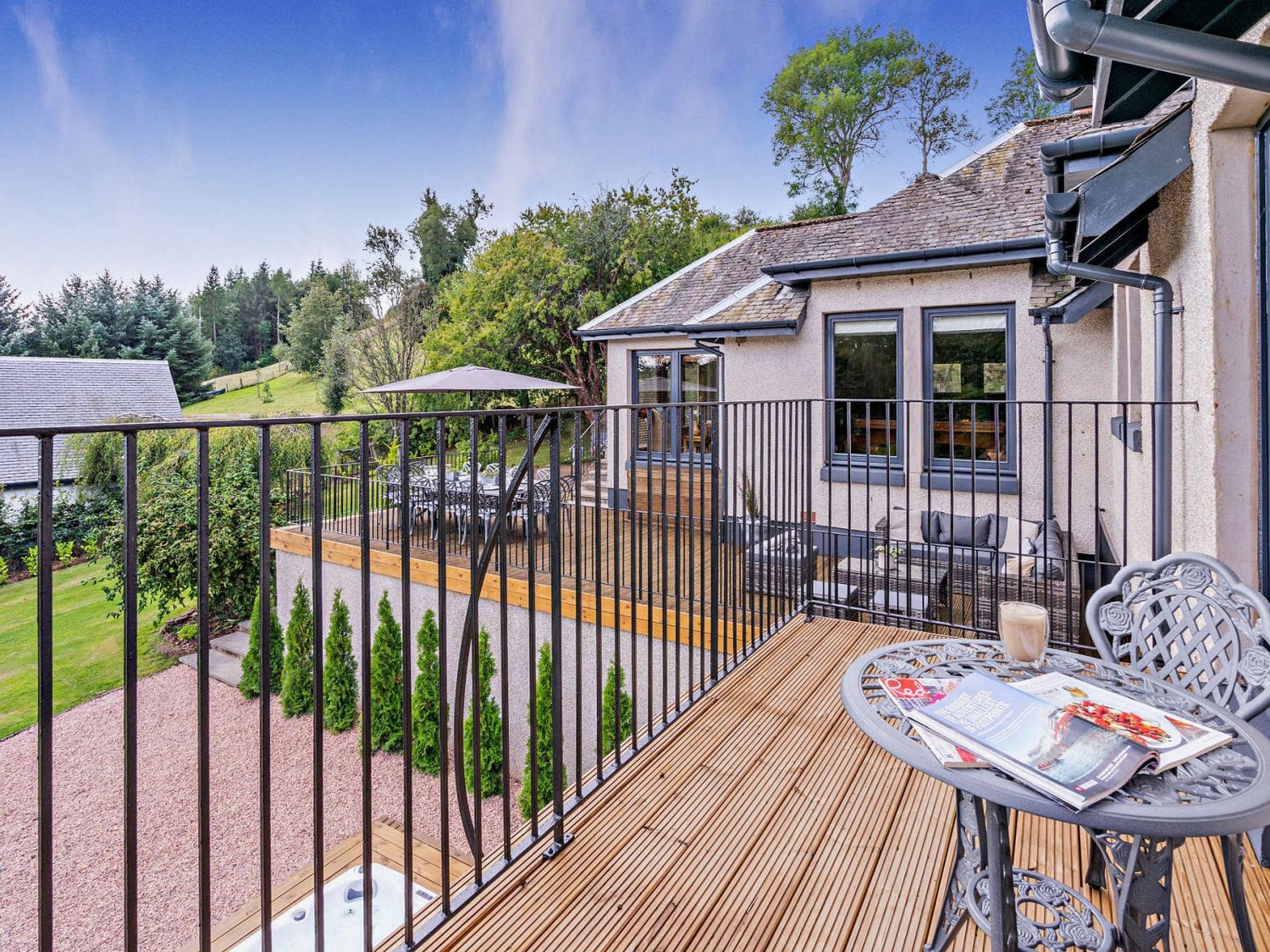 Landscaped gardens with terrace, fire pit and BBQ, plus a luxurious hot tub to unwind with family and friends