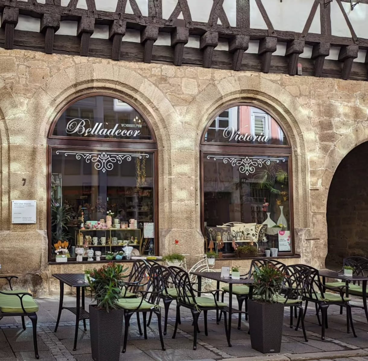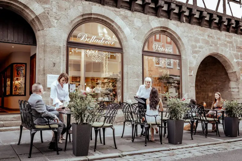 What particularly delighted us was how beautifully the tables and chairs blend into the historic surroundings of Ketschengasse. Our café is located in the Münzmeisterhaus, one of the oldest half-timbered houses in Germany. The refined patterns and classic look of the furniture complement the architecture wonderfully and help convey the café’s unique charm to the outside terrace.