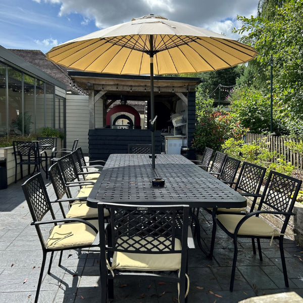 Products you’ll find here: The Alice table with Jane Chairs in Antique bronze, sandstone parasols and cushions, and the Isabelle table.