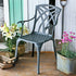 The April chair in slate is a very comfortable chair which perfectly complements many different tables in our classic range and is offered as a choice for multiple table sets. It has an intricate metal work design, featuring overlapping arcs on the curved back and a lattice design on the seat. Beautifully crafted in cast aluminium, this versatile chair will greatly enhance your outdoor dining. April is a relatively lightweight chair which makes moving it around easy. The cool slate finish works well in both contemporary or traditional gardens.
