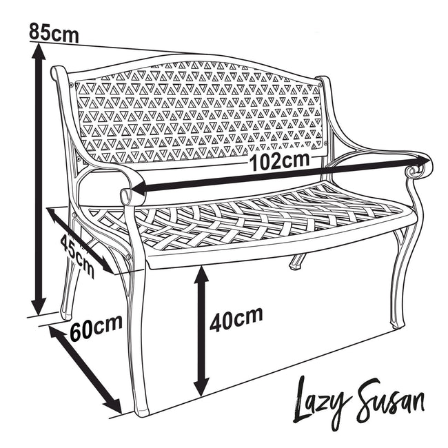 The July bench in antique bronze features a symmetrical criss-cross metalwork pattern throughout. Beautifully crafted in cast aluminium, this bench is strong and sturdy, but can also be moved around the garden with ease. Place the July bench on its own in a sunny spot or mix it up and use it as additional seating for your outdoor garden table. Perfect for relaxing with a book or sharing with a friend for a cup of coffee and a chat. The antique bronze finish is classic and looks good in any setting.