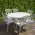 The June 6-seater garden furniture set in fresh, bright white is one of our bestsellers. Beautifully crafted in cast aluminium, it features an oval dining table with an intricate lattice top and classic double-helix border. Complete with 6 comfortable April chairs, this popular garden table set is perfect for entertaining. Ideal for an outdoor brunch or lazy afternoon bbq, simply pair with seat cushions and a parasol and enjoy those long summer days with friends or family.