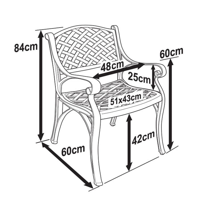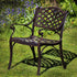 The Kate chair in antique bronze is a substantial chair which features a wide criss-cross metalwork design. This outdoor dining chair combines graceful lines with strength and durability. It comes complete with adjustable foot pads to improve stability and make it suitable for any outdoor surface, be that lawn, gravel, paving stones or decking. The Kate chair in classic antique bronze is offered as a choice with many of our garden furniture sets for a small extra cost.