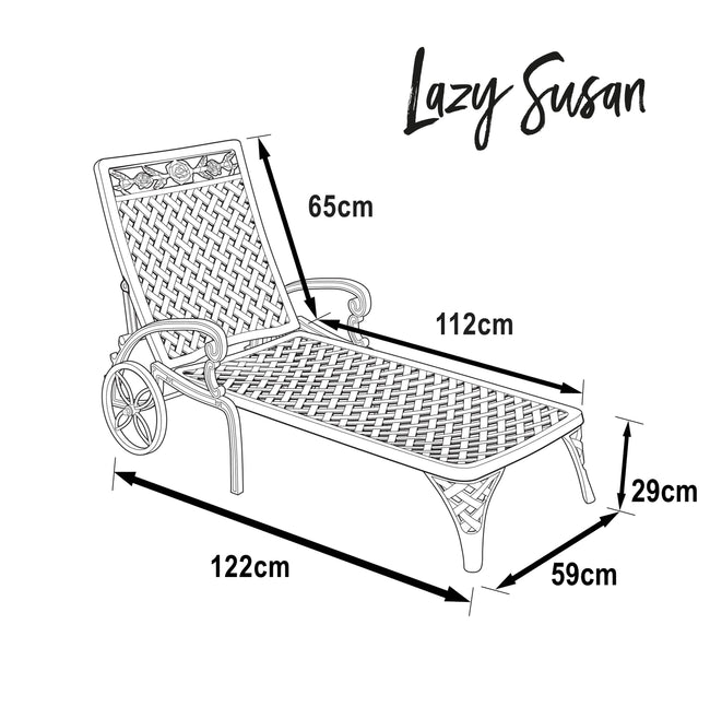 The Rose lounger in slate is designed with serious relaxation in mind. Beautifully crafted in cast aluminium this recliner features intricate latticework throughout with a rose garland motif on the back. Lazing in the sun has never been more comfortable than with the elegant Rose lounger. Place it in a sunny spot in your garden, or around a pool and unwind in style. The cool, slate grey finish perfectly co-ordinates with our wide range of outdoor garden furniture.